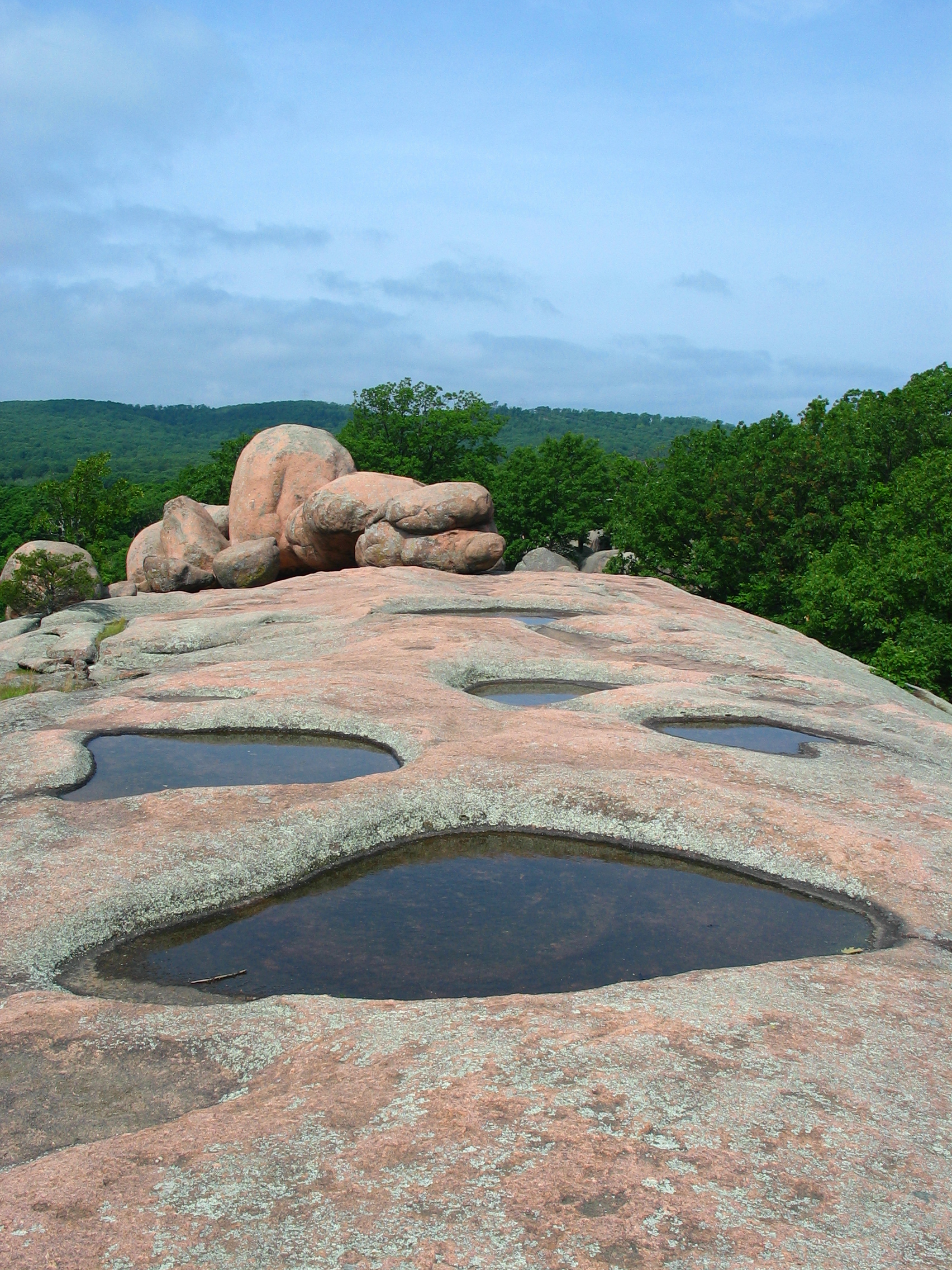 The granite itself formed about 1.5 billion years ago as magma cooled and crystallized.  The giant boulders are a result of joints developing within the granite which was subsequently exposed at the earth’s surface where weathering processes “separated” the boulders from the rest of the rock mass.  These boulders, as their name implies, reach some massive sizes.  The largest of which, affectionately called “Dumbo“, is an astounding 680 tons!  As evidenced by an abandoned quarry within the park, the granite at this location, and many others in the area, was exploited for a variety of uses, most notably monuments.