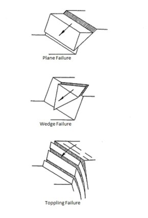 Slope failures associated with unfavorable orientation of discontinuities (modified after Hoek and Bray, 1981)