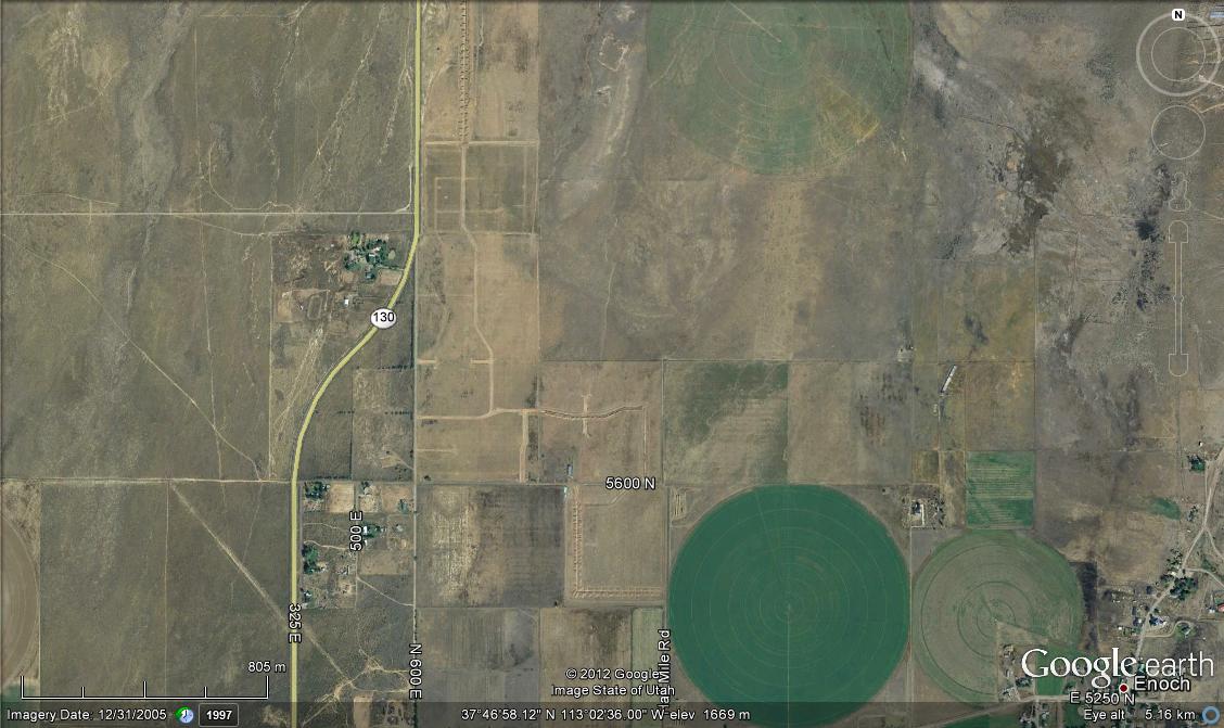Here’s an aerial view from Google Earth. Unfortunately, this image is still from 2005 (prior to the roads being completed and subsequently abandoned), but if you look closely, you can see a rather long pre-existing earth fissure trending generally North-South just north of the unpaved roads.